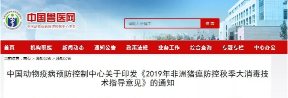2019年10月22日,中國動物疫病預(yù)防控制中心為做好全國秋季“大清洗、大消毒”專項行動,起草了《2019年非洲豬瘟防控秋季大消毒技術(shù)指導(dǎo)意見》,指導(dǎo)養(yǎng)殖企業(yè)的秋季消毒工作。